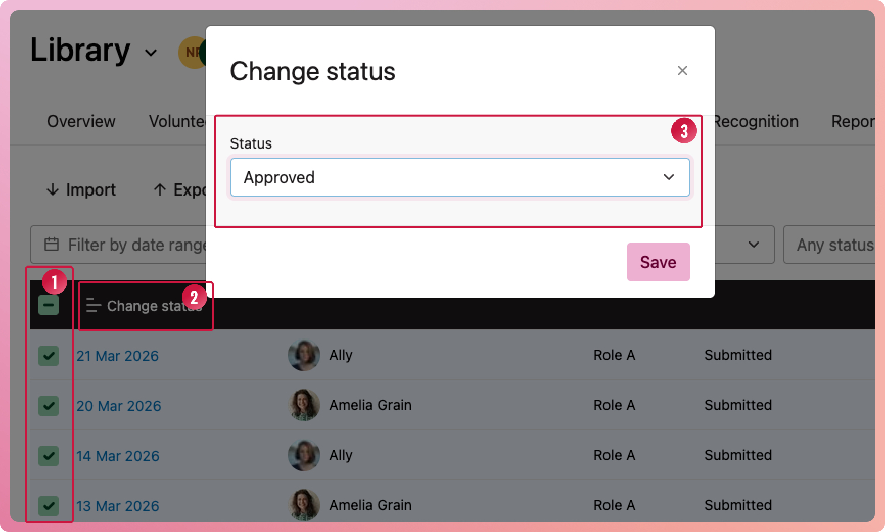 - When the modal appears, select what status these timesheets should have, then select save.