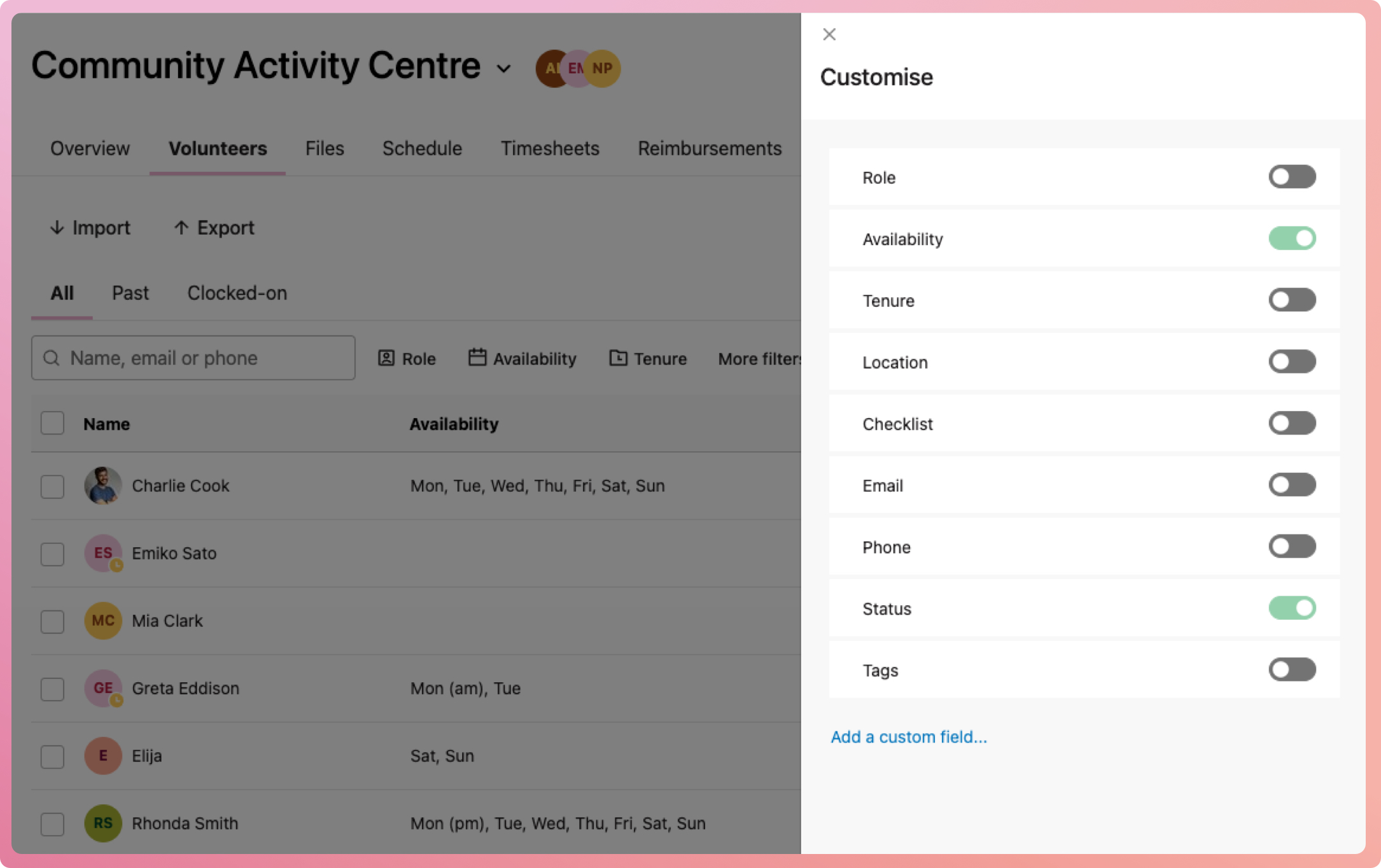 - Select the Customise button located on the right-hand side above the volunteer list