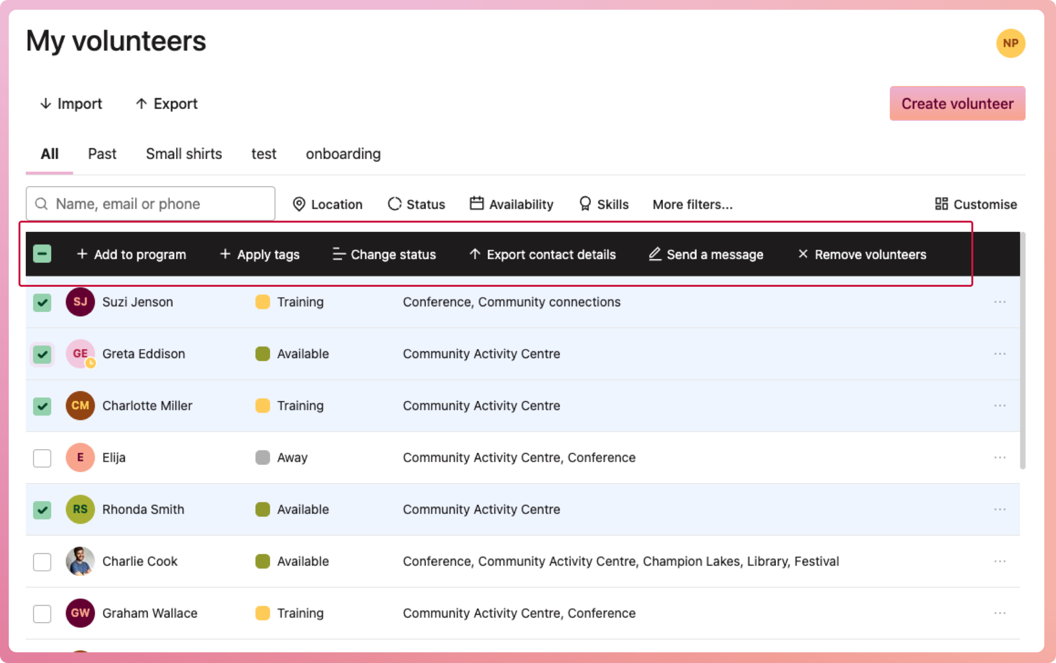 Update or message more than one of your volunteers at a time with the help of the bulk-actions bar.