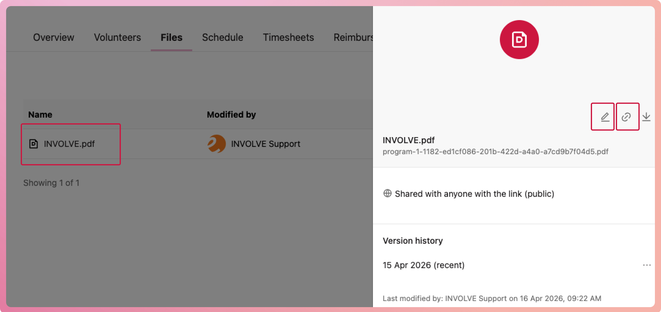 You can upload a document (like a pdf) or an image to INVOLVE and share a link to this with your volunteers. Sharing a link to the one file ensures everyone is accessing the most up-to-date file as you can replace the file with a new version if need be.