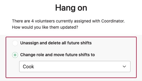 Note: If you attempt to delete a role to which a volunteer is assigned, a modal will appear to ask if you would like to unassign or reassign them.