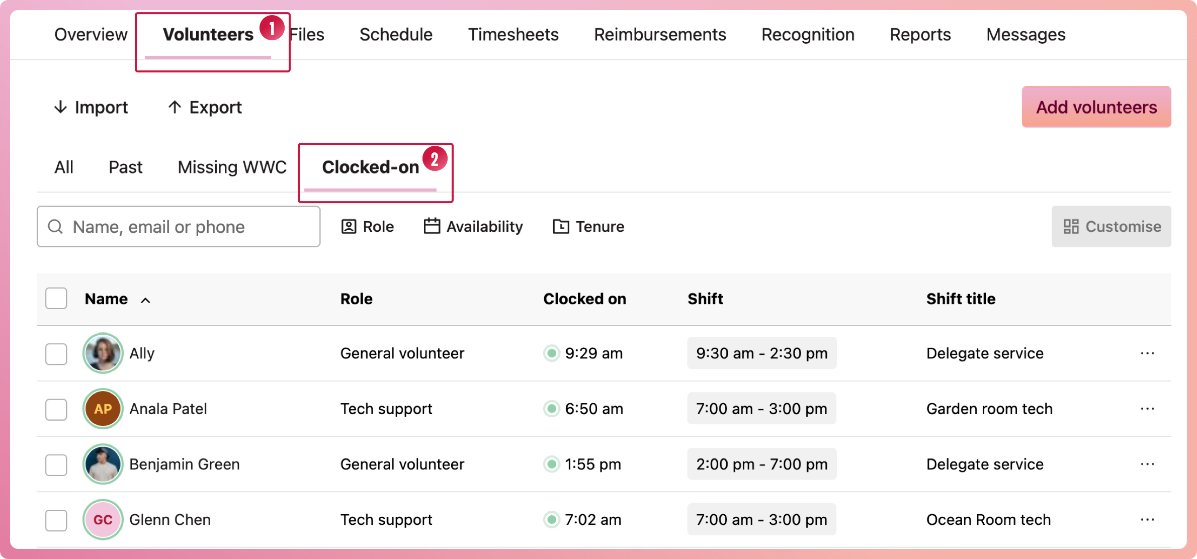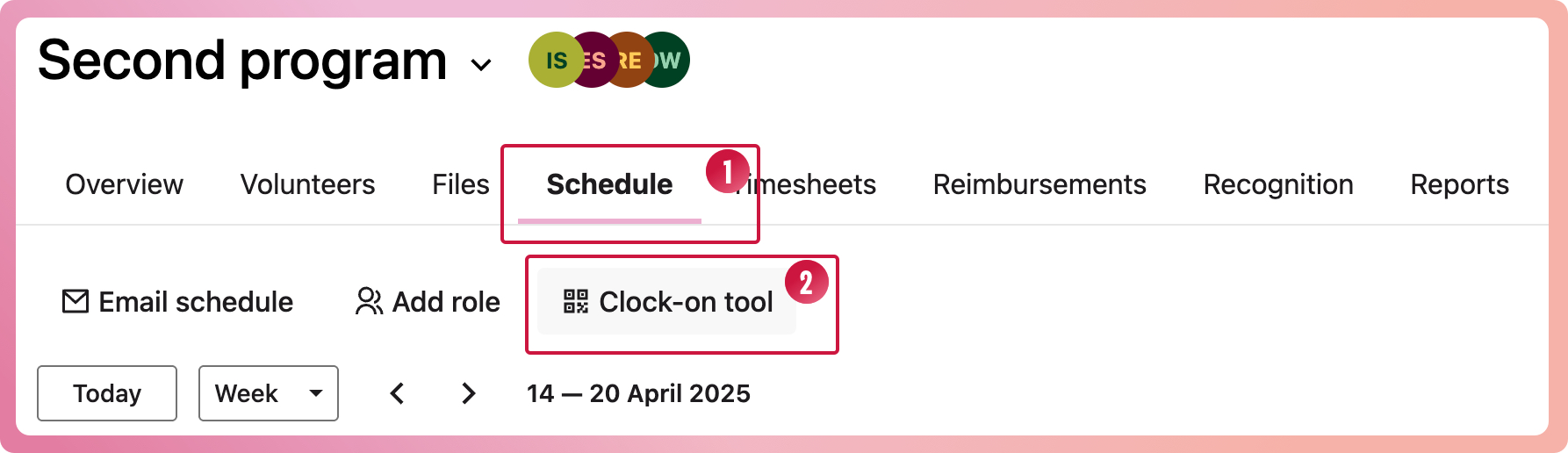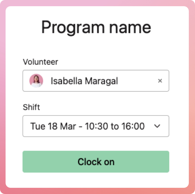 The Clock-on tool helps record volunteering hours by allowing volunteers or managers to easily clock on at the start of a shift and clock off at the end. This can be done alongside a program schedule or instead of one.