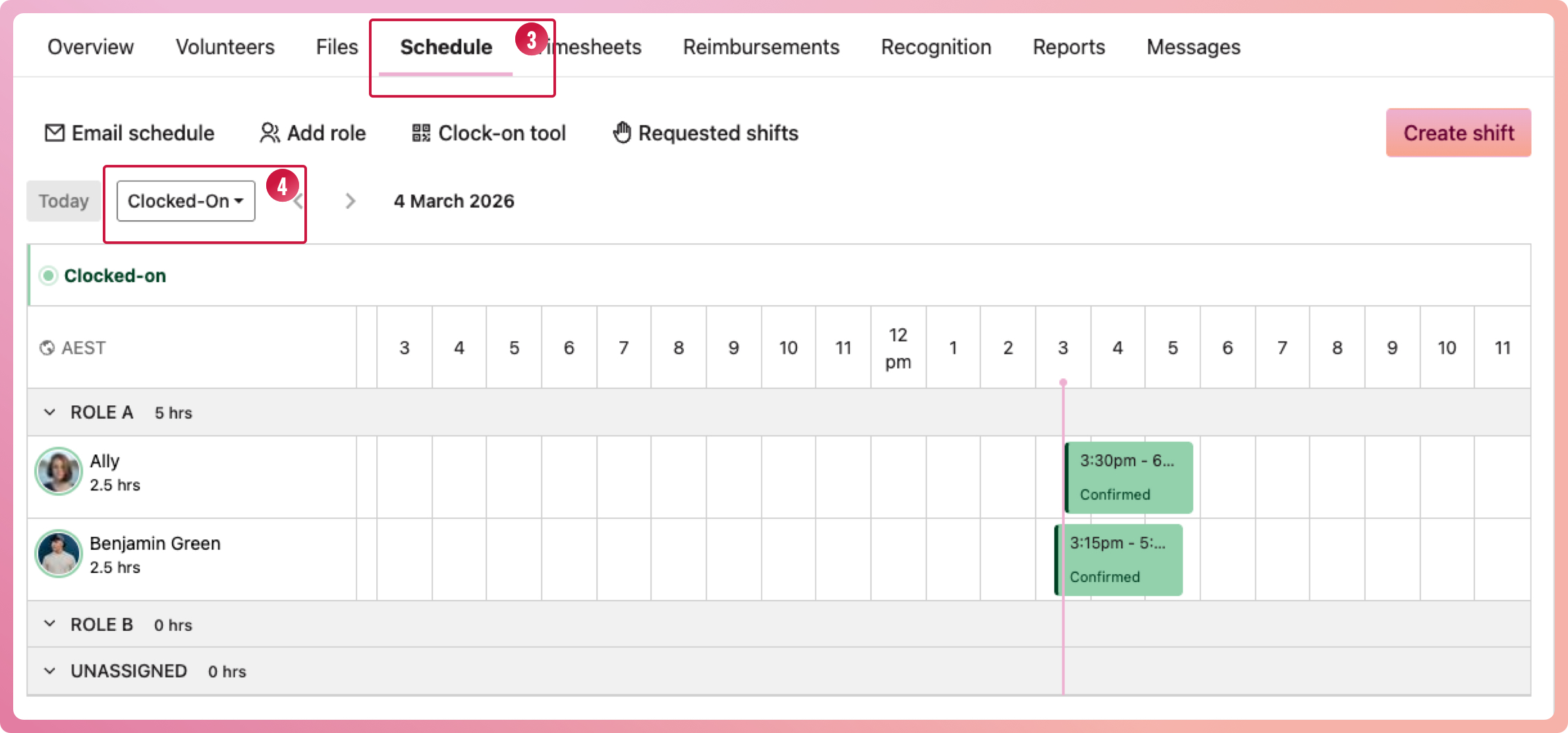All shifts recorded using the Clock-on tool will appear as timesheets when the volunteer clocks off at the end of the shift.