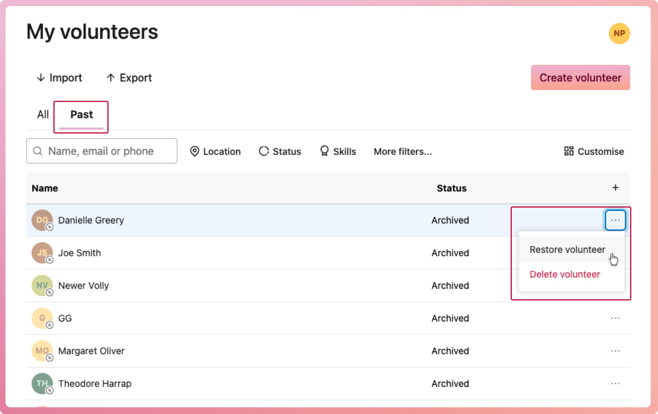 3. Select the context menu button (three dots) located on the right-hand side of their row, then select Restore volunteer