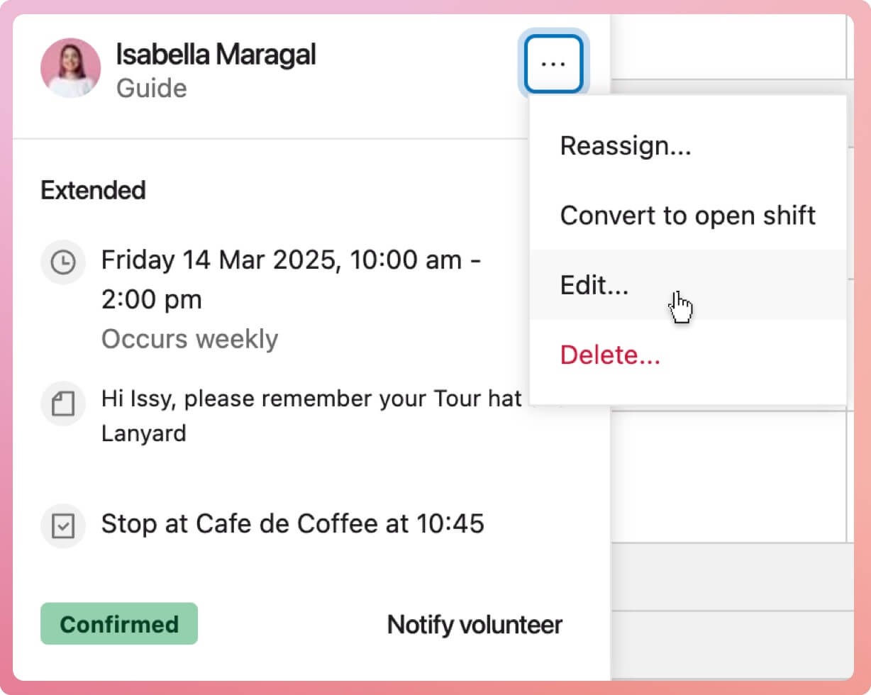 7. Shift popover - activated by selecting a shift cell, this is a snapshot of the shift details including the shift title, time, status, a link to notify the volunteer of this shift and the edit menu to delete or update the details.