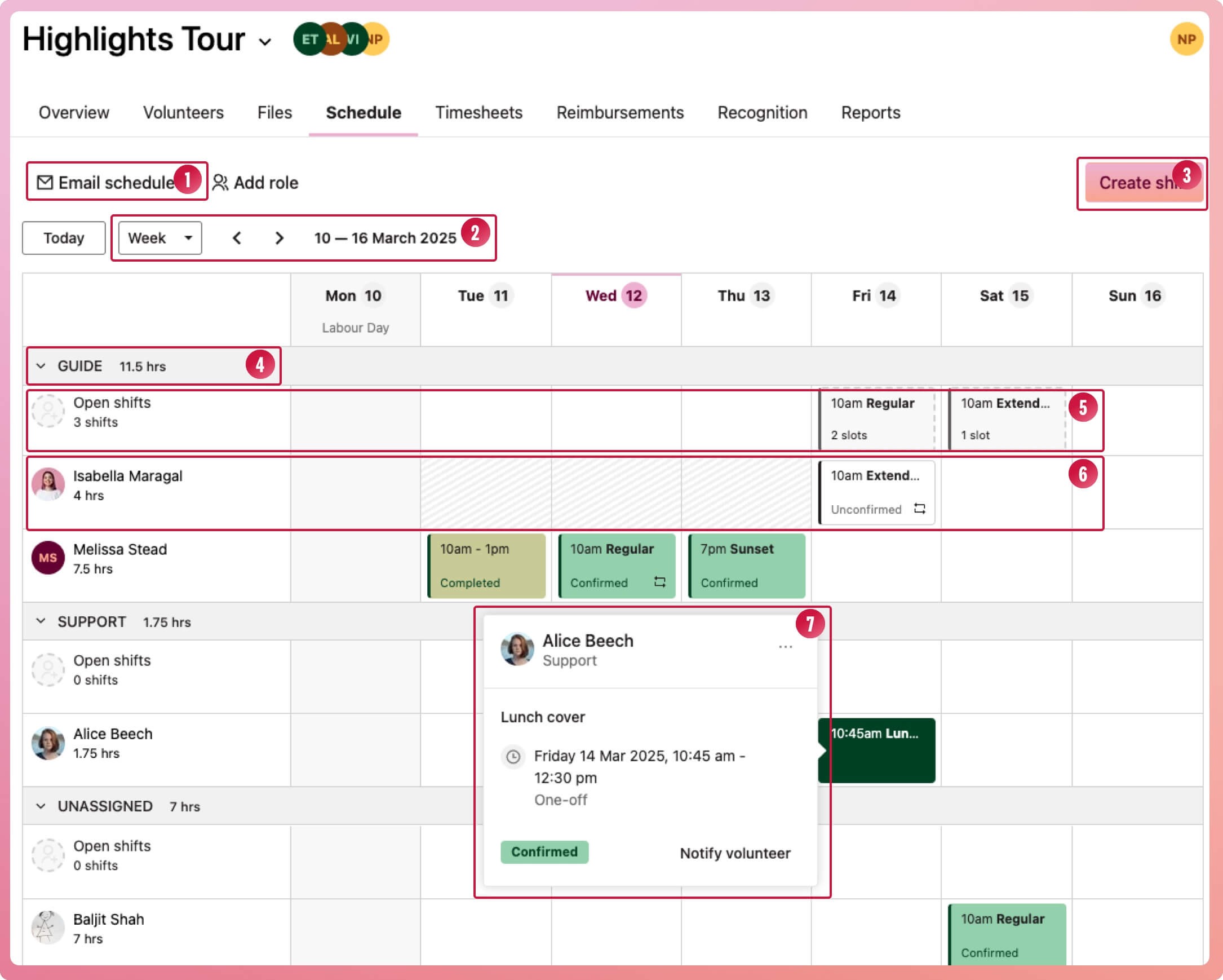 6. Volunteer shift row - The volunteer's shifts for that day/week/month. Public holidays and volunteer availability are marked on their schedule so you know when they can volunteer.