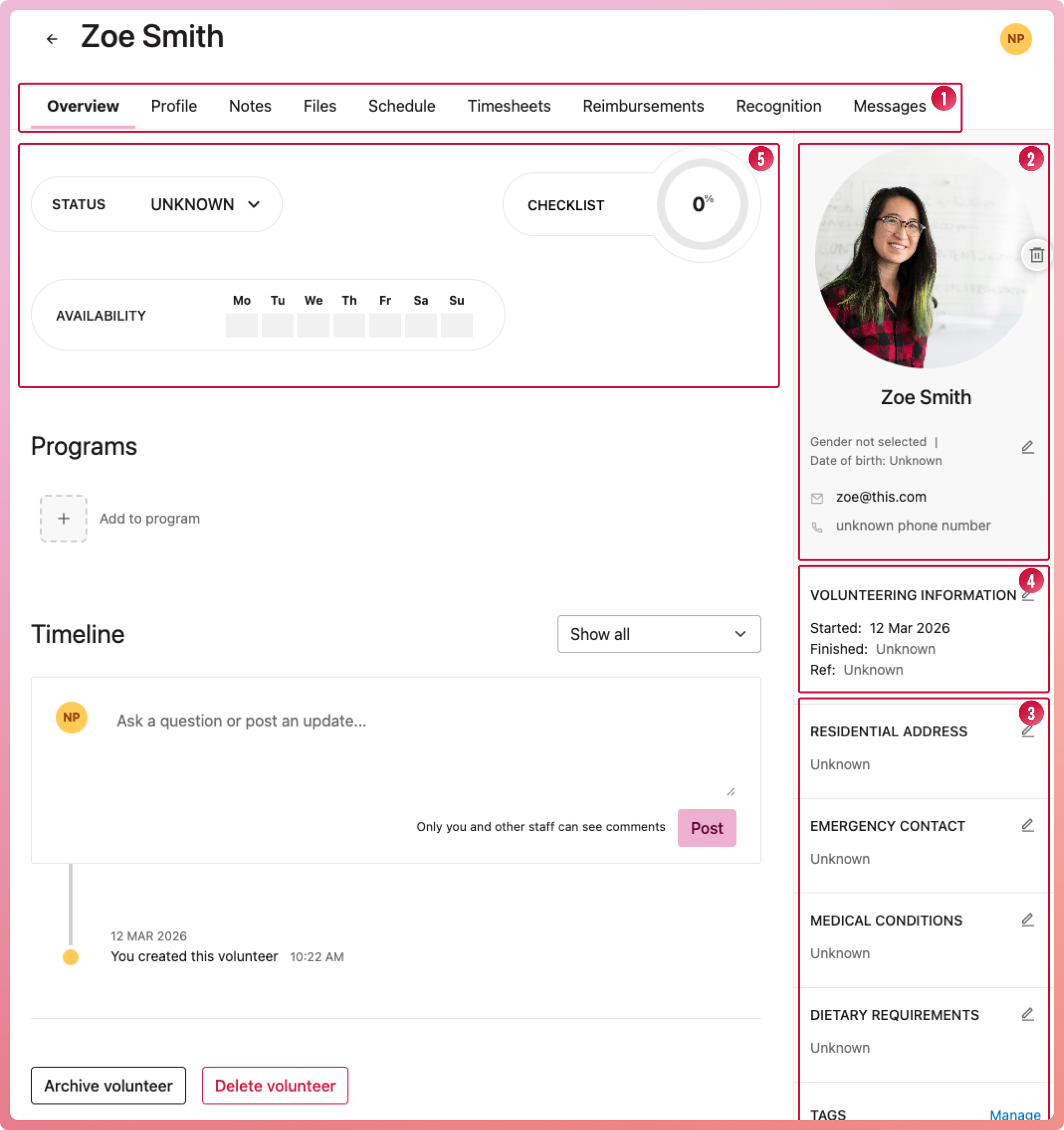 - Overview - includes the volunteer's identifying information, such as their name, email, date of birth, and avatar (2), as well as personal details like their address, emergency contacts, and dietary requirements (3), and their volunteer tenure (4). It also shows their availability, status, and checklist progress (5), as well as the programs they are part of.