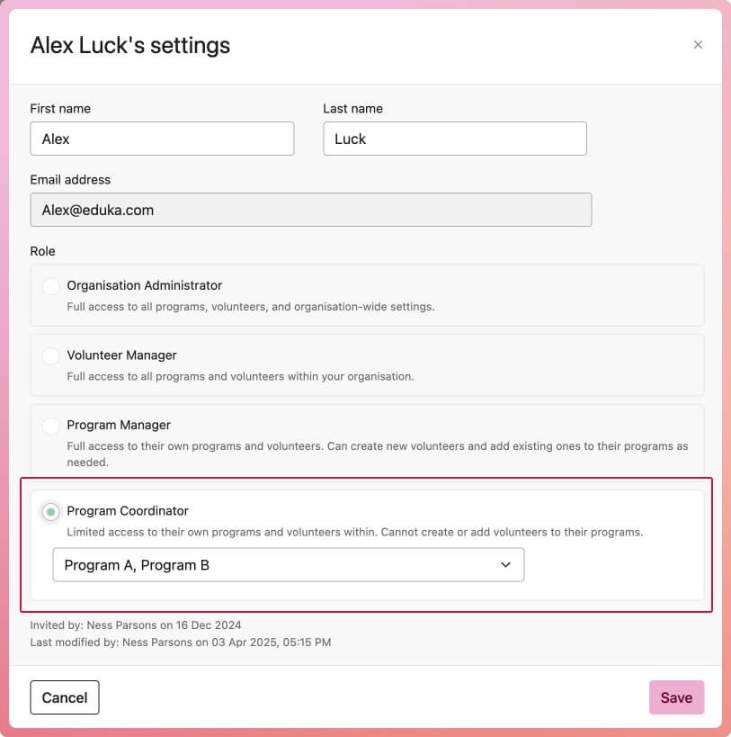 Program Coordinators can only access programs they're assigned to by an Organisation Administrator or a Volunteer Manager. Assigning Program Coordinators can be done in two ways: