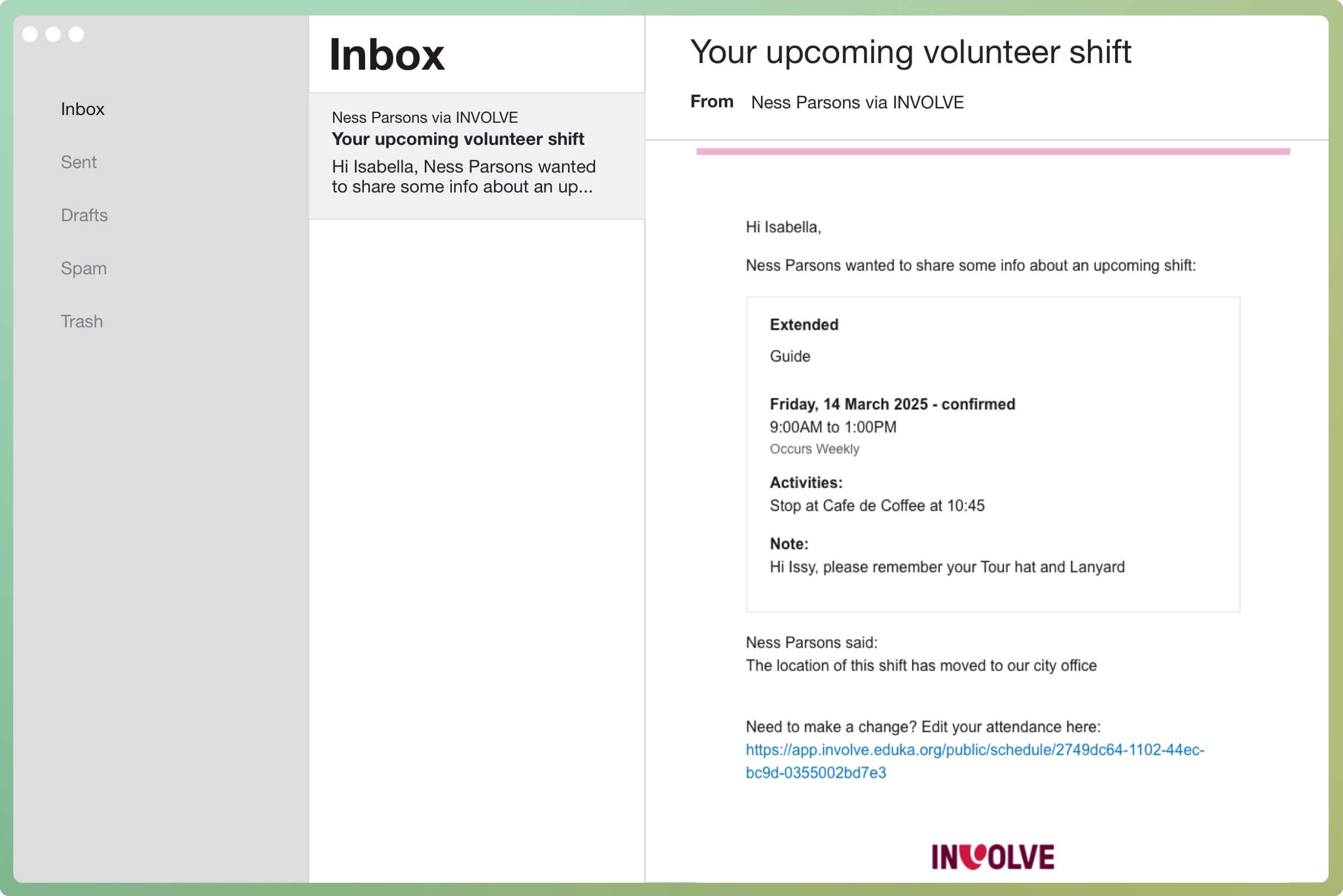 The volunteer will receive an email notification with the shift details and the message.