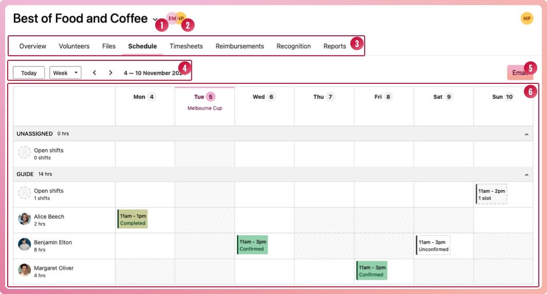 Sub navigation - access the different program views, including the list of volunteers assigned to this program, the program schedule, timesheets, files, reimbursements, recognitions and reports.