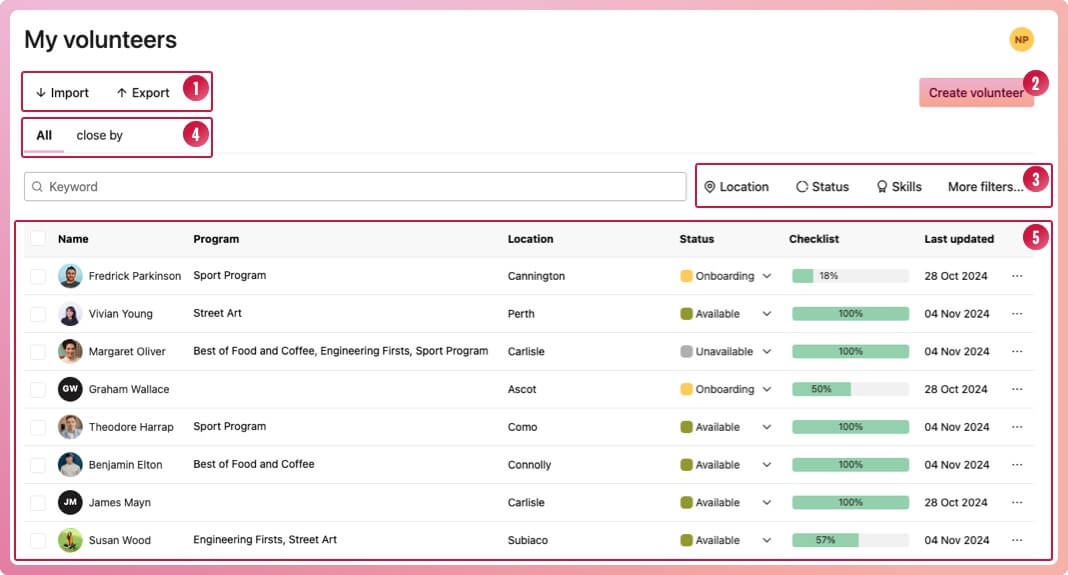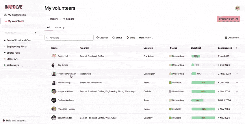 Filter volunteers - search keywords or filter your volunteers by location, status, skills and more