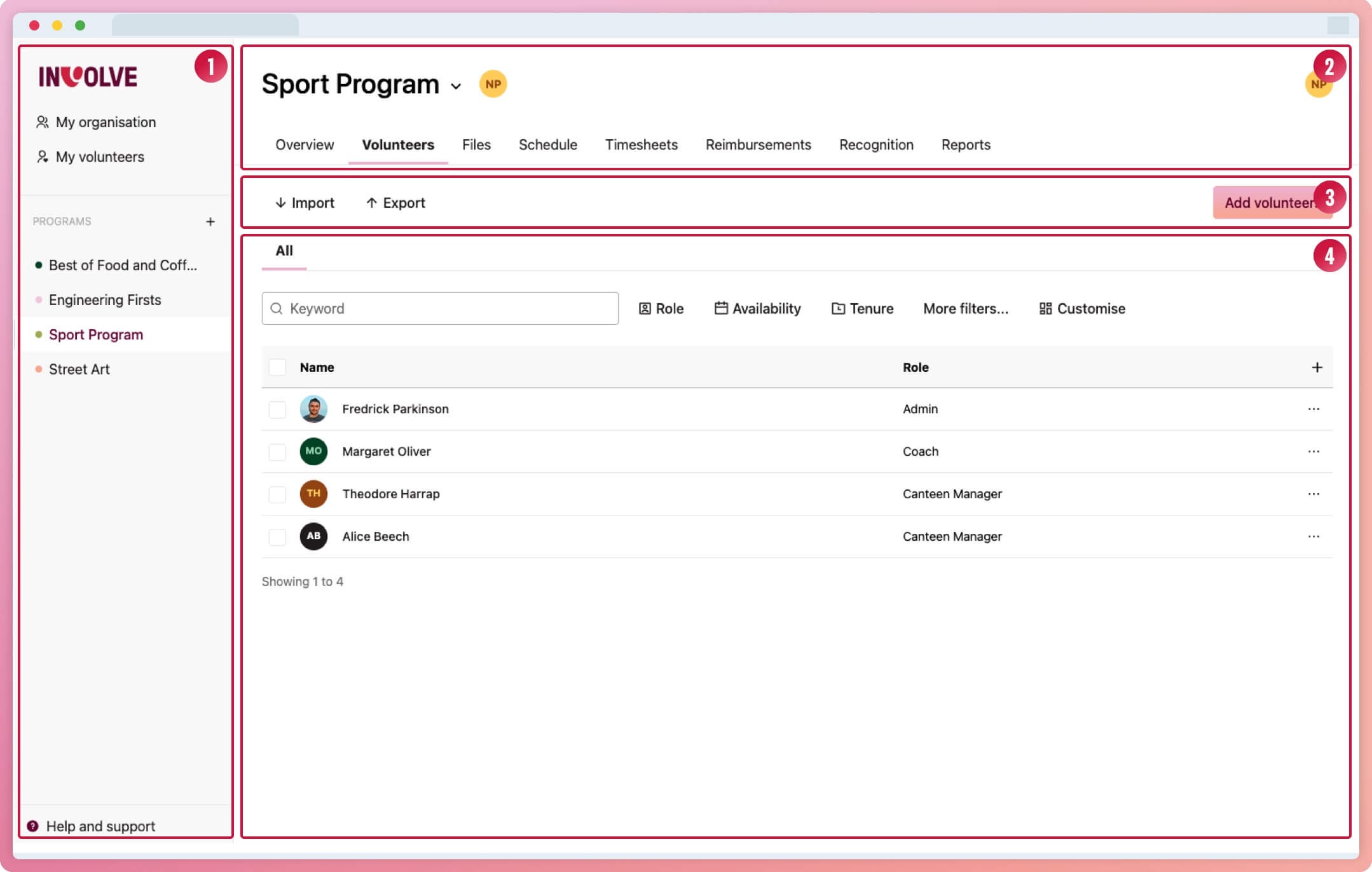 Each program contains a sub-group of your organisation's volunteers, schedule, and reports.