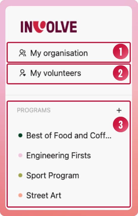 Navbar - Access your organisation, volunteers and program sections from here; more on this below