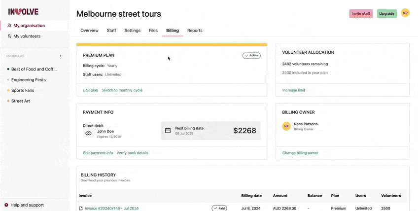 My Organisation contains details and organisation settings, like the default timezone and onboarding checklist templates. It is also where staff are added, important files can be stored, and organisation-wide reporting can be accessed. The Billing Owner will also be able to manage the organisation's INVOLVE subscription details.