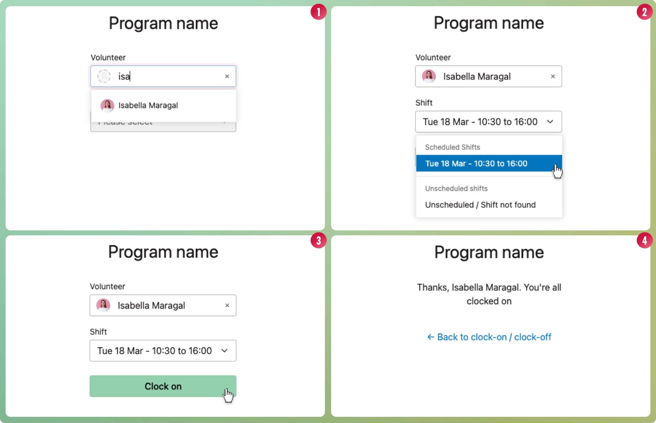 When you arrive for that day's shift or session, you will need to enter your name and select a shift on a web form to clock on successfully.