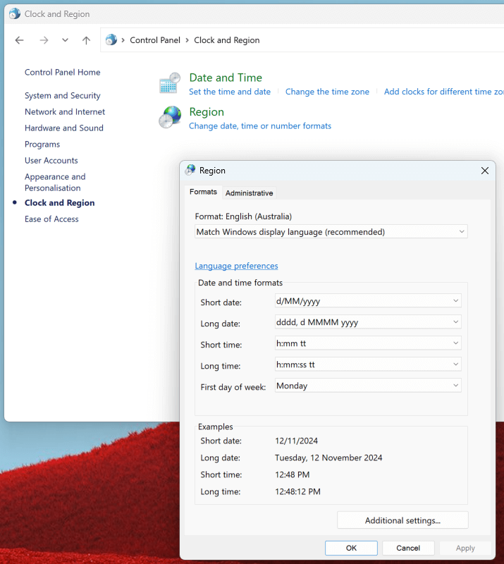 Windows: Go to Control Panel > Clock, Language, and Region > Region. Change the format in the "Formats" tab